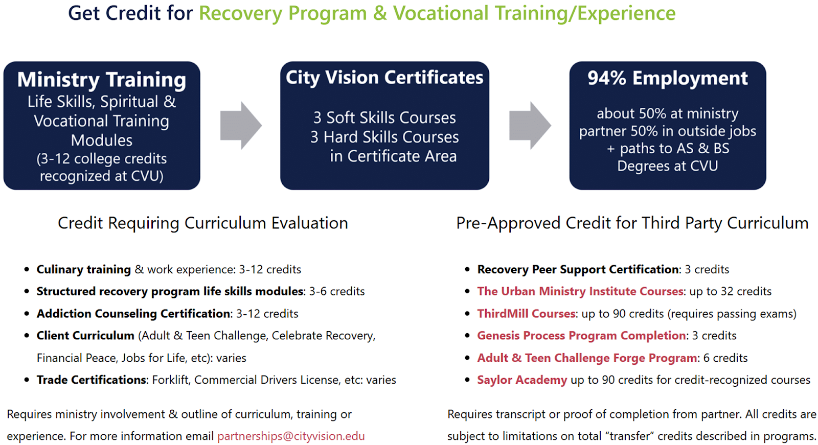Most of the above curriculum and resources from Rescue Missions can be integrated into a path with City Vision University through credit recognition, as shown below:
