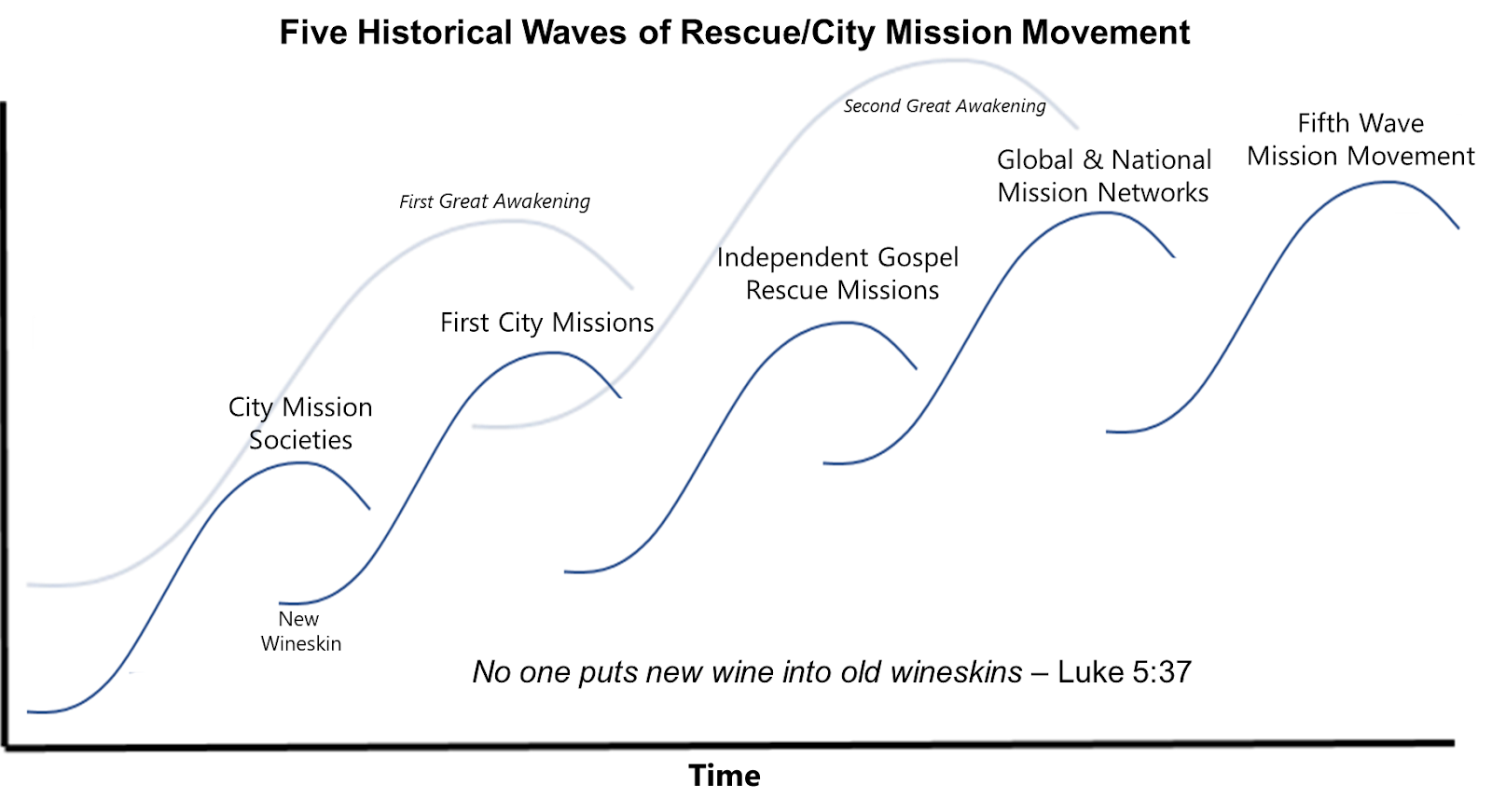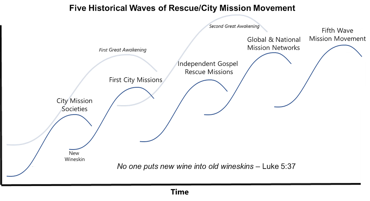 The diagram above shows the five historical waves of the City Mission/Rescue Mission Movement. In this article series, you’ll learn how each of these eras where each represents a major innovation extension or ministry recontextualization: