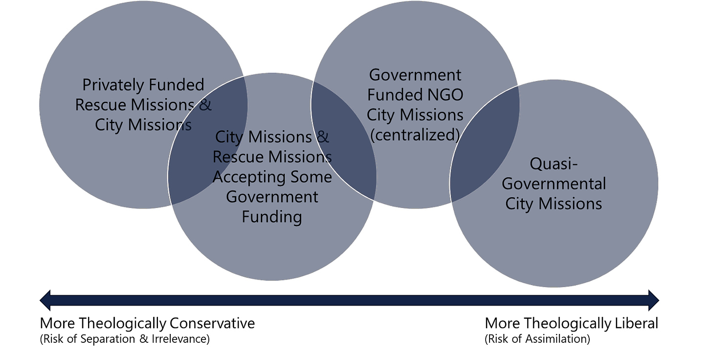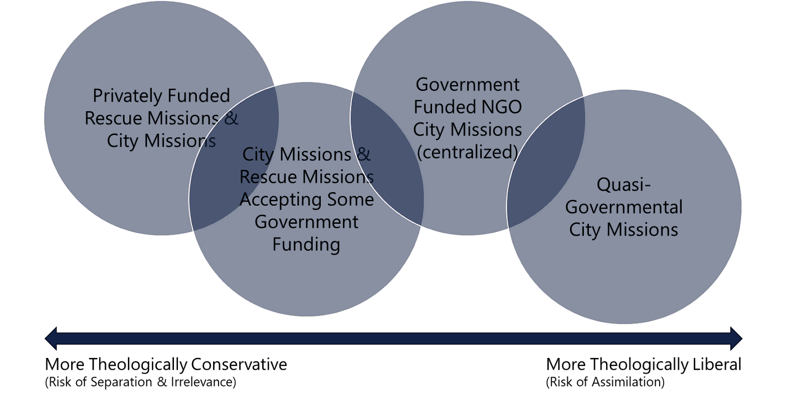 All City/Rescue missions can also be categorized into a typology as shown below. Our presentation A Typology of Faith Based Organizations provides a more detailed explanation of a similar typology that is generalized beyond the city/rescue mission movement. It’s worth noting that the theological and cultural difference between Privately Funded City/Rescue Missions and Quasi-Governmental City Mission are vast, so it is arguable that they are entirely different movements at this point.