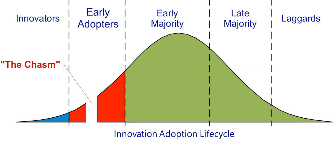 The Innovation Adoption Lifecycle is the most significant aspect of Rogers’ theory. Rogers identified a pattern that as innovations spread, people adopt them at different rates as shown above, falling into categories of Innovators, Early Adopters, the Early and Late Majority, and finally, Laggards. Similarly, often those leading innovation are often most effective at leading in one or two of these stages. Geoffrey Moore later popularized the term “The Chasm” to point out the critical gap that separates the early adopters and innovators from the more cautious mainstream market.