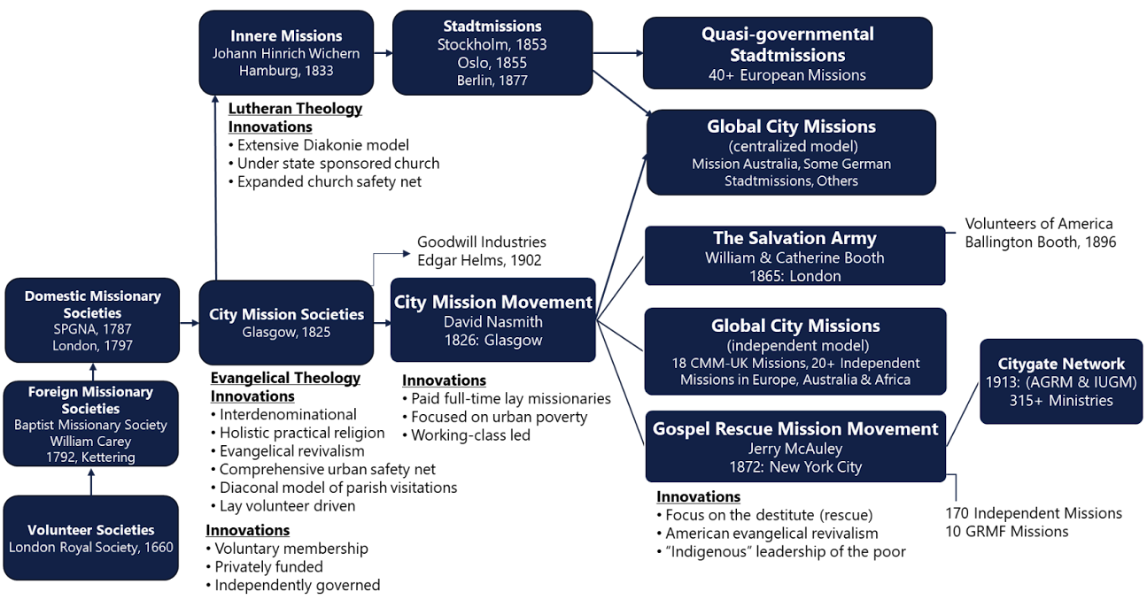 Today, the global City Mission Movement outside of North America could be divided into four branches, as shown in blue boxes in the upper right of the City Mission/Rescue Mission Family Tree here and in the diagram below.