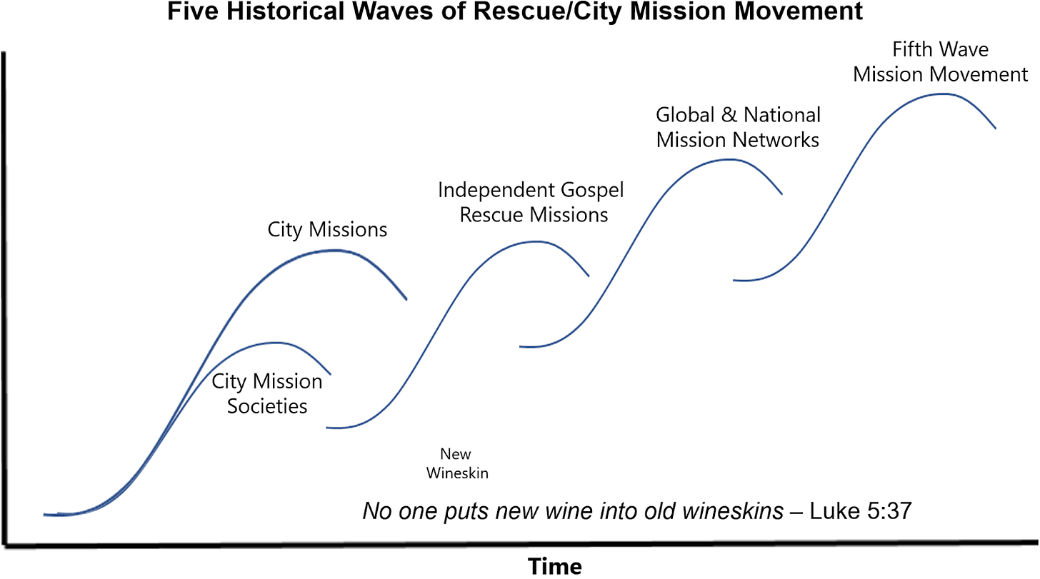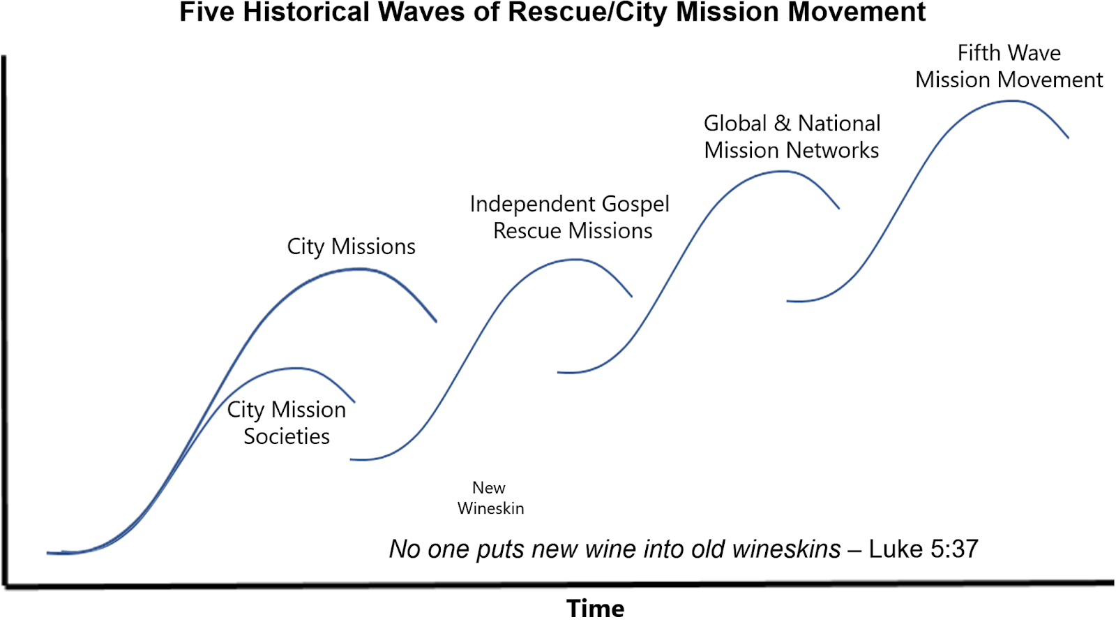 This article focuses on the City Missions as the second wave of the Rescue/City Mission Movement. The first wave (City Mission Societies) and the second wave (City Missions) largely emerged at the same time, as shown in the diagram below. However, I believe City Missions should be characterized as a second wave because there are very significant differences between the vision and mission of early City Mission Societies and what we now call City Missions.